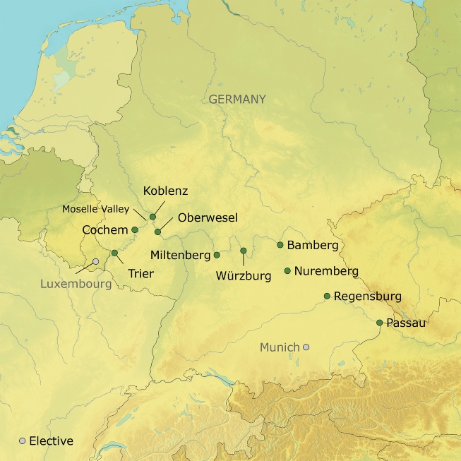 Europe’s incomparable history and heritage are yours to discover on this handcrafted, night-nine cruise! Board your exclusively chartered, first-class ship in Passau, Germany and sail away through the sculpted hills lands of the Main, Rhine and Moselle rivers. Daily excursions showcase ancient monuments and charming towns, UNESCO World Heritage sites and vine-laced slopes. Travel to romantic Regensburg to visit a Benedictine monastery and enjoy a brandy tasting in Miltenberg. You’ll stroll through Trier, Germany’s oldest city; cruise through the Rhine Gorge, a winding stretch renowned for its beauty; and stroll through lovely Koblenz, where the Rhine and Moselle rivers meet. In Cochem, admire half-timbered houses on cobblestone lanes and visit a stately castle high above town. Plus, in the ports of Nuremberg, Bamberg and Würzburg, choose included excursions that fit your interest, such as cultural experiences and culinary tours. Along the way, indulge in insights from experts, regional dishes and local wines. This heartwarming journey includes an ample meal plan, plus wine and beer with lunch and dinner. No single supplement for solo travelers!