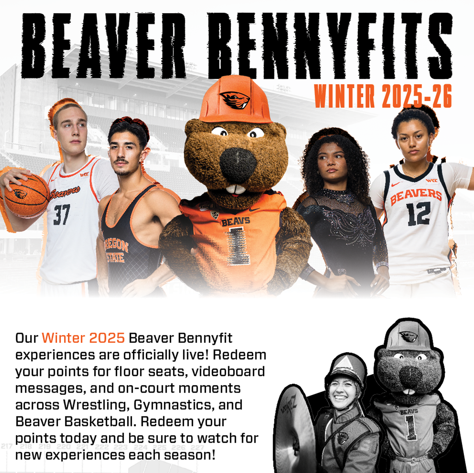Welcome to the Beaver Bennyfits Program, designed to provide our valued OSU Athletics Supporters with exclusive opportunities and unforgettable experiences. As part of this program, you earn points for your support: 1 point for every dollar you contribute to the Our Beaver Nation Fund, OSU Athletics Fund for Excellence, or the FEARLESS: Women of OSU Athletics Fund; 1 point for every dollar spent on season ticket purchases; and 15 points for attending each OSU home sporting event. Points can be redeemed for a variety of unique and engaging experiences, including exclusive pregame moments with your favorite team and special opportunities that bring you closer to the excitement and spirit of OSU Athletics. See what amazing experiences we currently have available by clicking HERE.