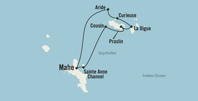 Sail from Mahe Island and feel the pace of life slow as you settle into elegant small-ship living. Cruise through the Sainte Anne Channel and visit Cousin Island, a protected seabird sanctuary. On Praslin Island, snorkel above vibrant coral reefs or visit the UNESCO World Heritage-listed Vallee de Mai Nature Reserve. Relax on a world famous beach on La Digue Island, home to the rare Aldabra giant tortoise. Aride Island, a nature reserve in the Indian Ocean, welcomes you with lush greenery, soaring cliffs and dozens of rare nesting bird species. Back on Mahe Island, stroll vibrant markets and enchanting botanical gardens before disembarking.