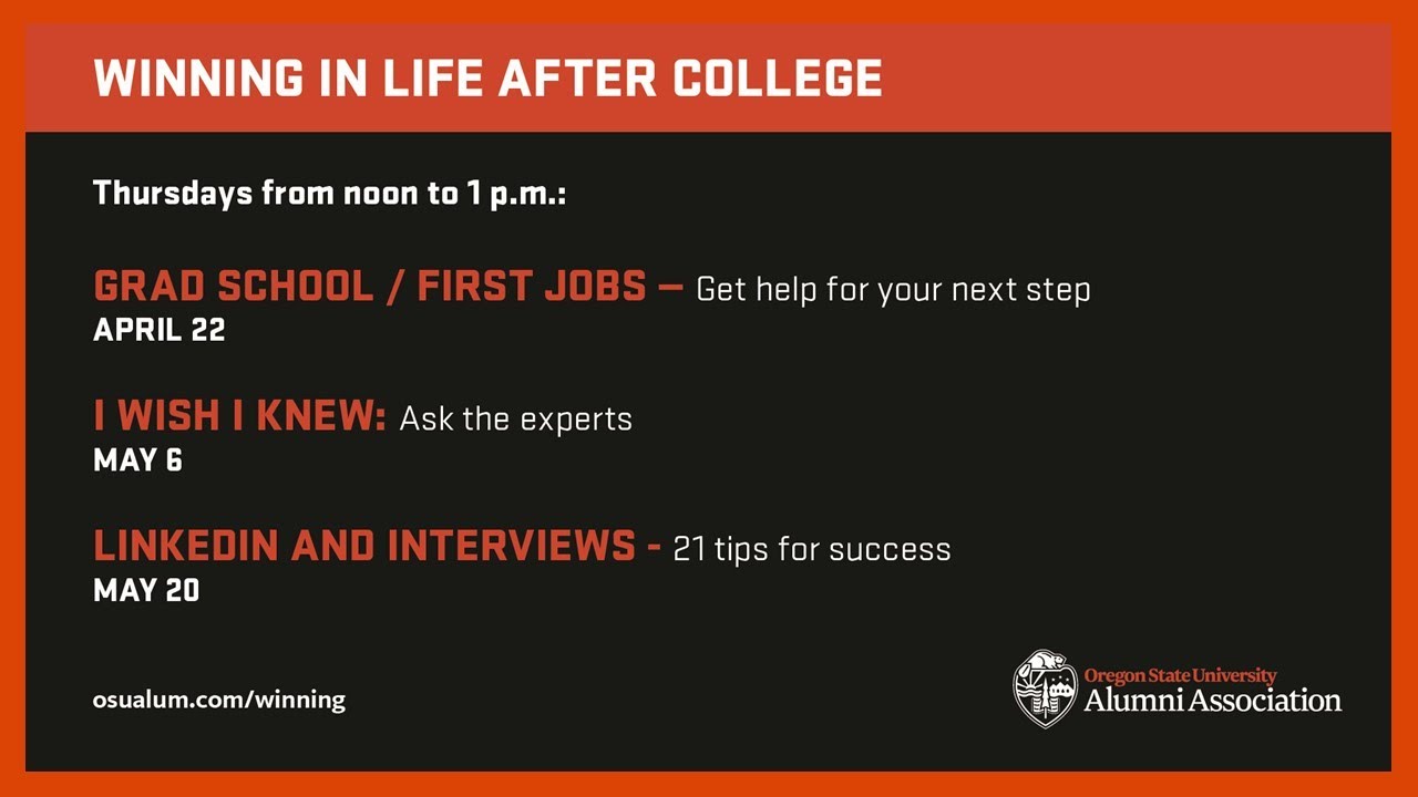 As part of the Beaver family, there’s a network of resources ready and available to support you throughout your career, no matter what stage you’re at. The OSU Alumni Association brings you a series of free virtual events on topics that are essential for your success.